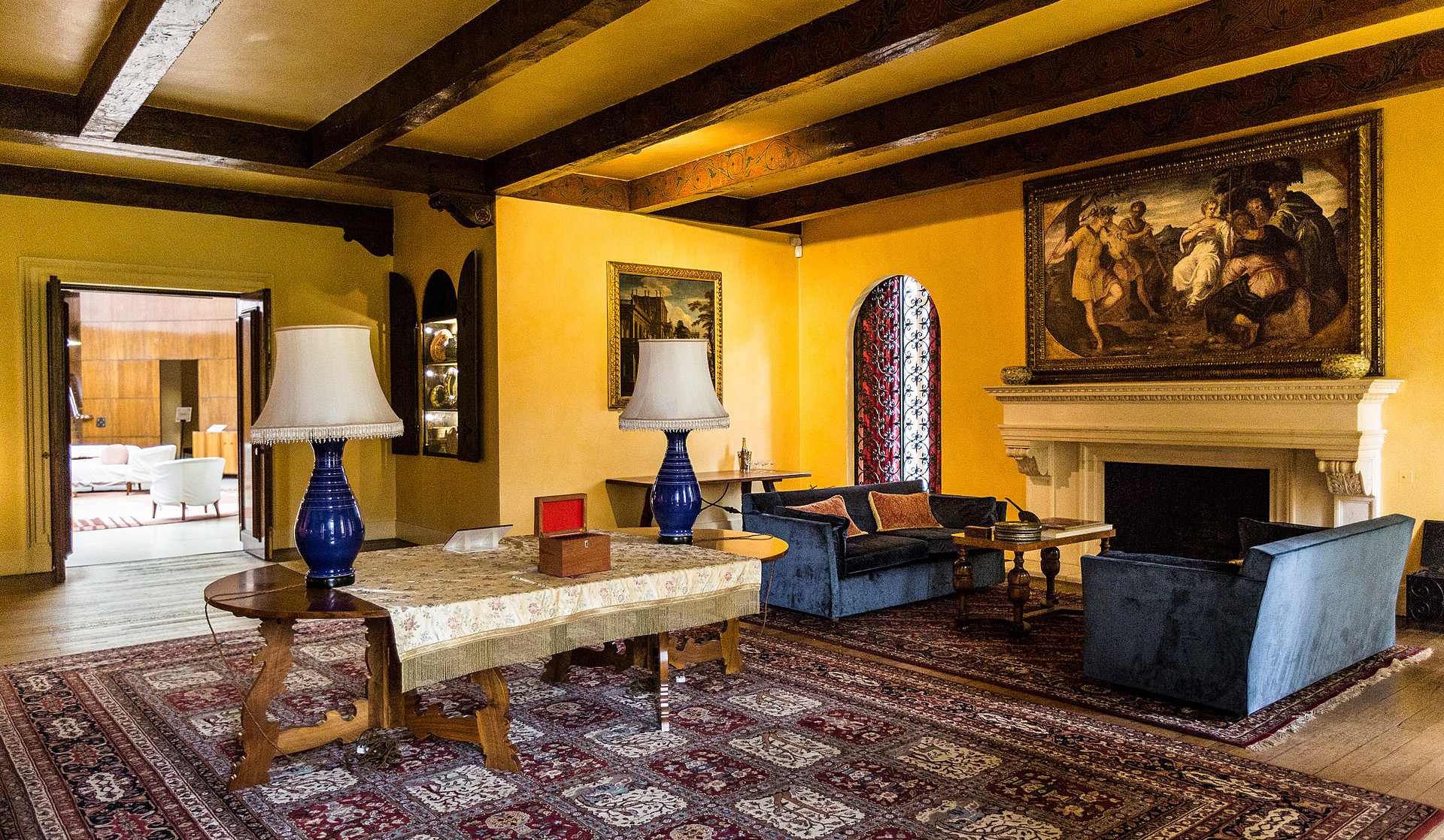 Separated from the main house only by a sliding Chinese lacquer screen the contrast between Art Deco and Medieval is stunning. The hall may be used for larger ceremonies, but more usually hosts dining and dancing - it looks wonderful with enhanced lighting. A minstrels' gallery may be used for live music performances. The room opens directly onto lawns, which parties can use in fine weather.