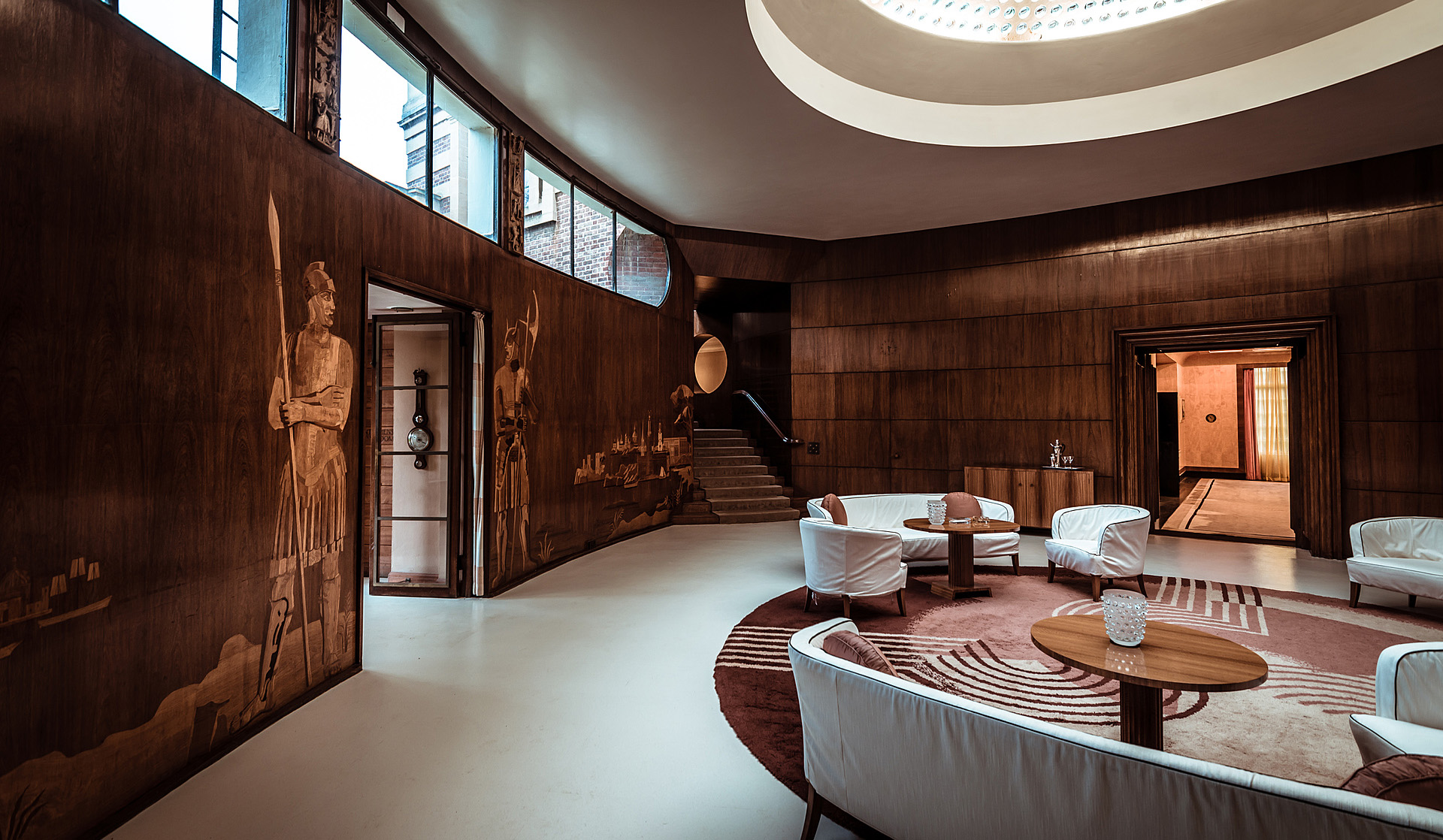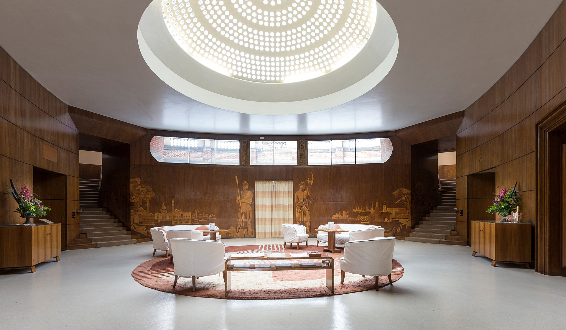 Inside, this circular wood-panelled room, exquisitely picked out in shades of coffee and cream, is a stunning setting for drinks. A pair of curved staircases lead to some first floor rooms whilst French doors lead directly to the terrace beyond, where drinks may be served in fine weather, overlooking the flower gardens.